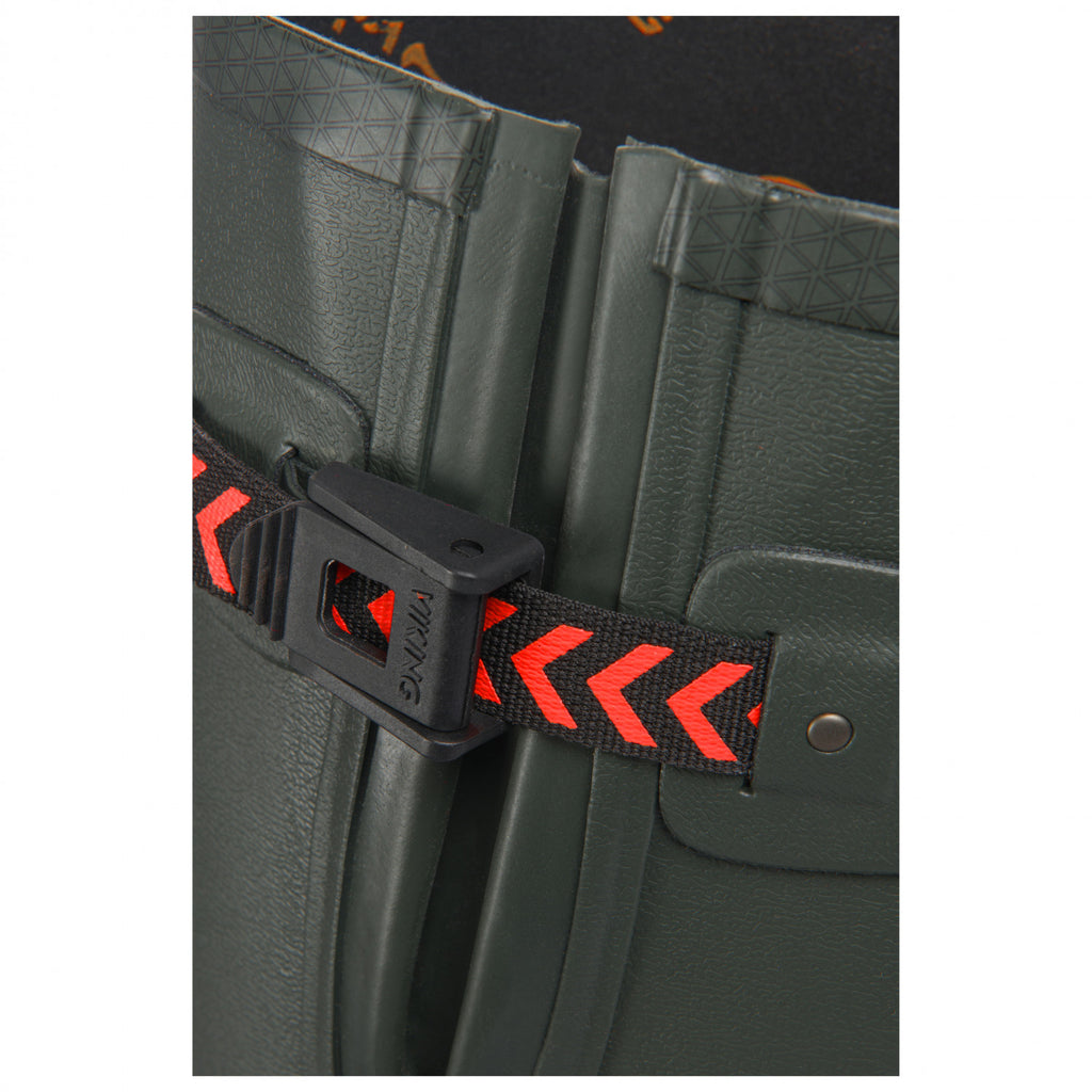 Viking Trophy -sarjan saappaat ovat jo käsite niin vaellus- kuin metsästyskäytössäkin! Tämä uusin versio Trophy High on jälleen kerran edellisestä paranneltu versio, jolle mikään mutainen polku tai epätasainen maasto ei ole edes haaste! Saappaat on valmistettu matalan tiheyden kumiseoksesta, mikä tekee saappaasta kevyen, kuitenkin laadusta tinkimättä. Kumin kolmikerrosrakenne koko saappaassa varresta varpaisiin lisää vakautta ja kestävyyttä. Trophy High -saappaassa on nimensä mukaisesti korkea varsi ja saappaan yläosaan on nyt lisätty solki, jolla saappaan istuvuuden saa optimoitua oman pohkeen mukaiseksi. UGC®-pohja on jämäkkä ja pitävä. Pohjan syvät monisuuntaiset urat peittävät koko pohjan, joten olipa mutaiset polut tai metsän jäkäläkalliot kuinka liukkaan niljakkaita tahansa, näillä saappailla pysyt pystyssä! Varren sisäpuoli on nopeasti kuivuvaa polyesteria ja muotoiltu EVA-pohjallinen takaa mukavat kilometrit pitkiinkin päiviin. Pohjallinen on luonnollisesti myös irroitettava kuivumisen/kuivattamisen helpottamiseksi. Saapas istuu mukavasti jalkaan varren ja nilkan kohdalta antaen kuitenkin jalkaterälle liikkumisvapautta.