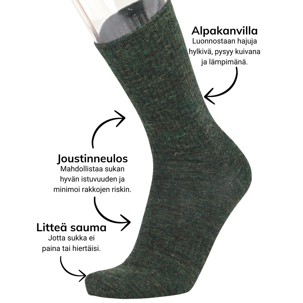 Helle on kevyt retkeilysukka ympärivuotiseen käyttöön. Sukka on todella miellyttävä jalassa, sillä sen varressa ja jalkapöydässä on lycralla vahvistettu joustinneule pitämässä sukan muodossaan ja estämässä hankaumien ja hiertymien muodostumista. Linkittämällä tehty kräkisauma on kestävä ja huomaamaton kengässä. Alpakanvillaan kosteudensiirto- ja hengittävyysominaisuudet pitää jalat kuivana normaalia sukkaa huomattavasti paremmin ja kun vielä alpakanvilla on antibakteerista, niin eipä ala sukat tuoksahtamaan pahalle pidemmälläkään vaelluksella! Sukat on helppohoitoiset, sillä pelkkä tuuletus riittää. Mieti - voit siis jättää sään salliessa sukat roikkumaan vaelluksella puun oksaan yöksi ja aamulla voit taas vetää raikkaat sukat jalkaan!