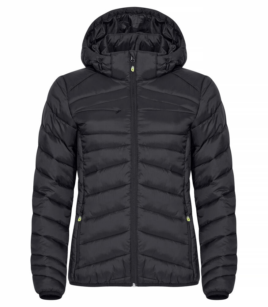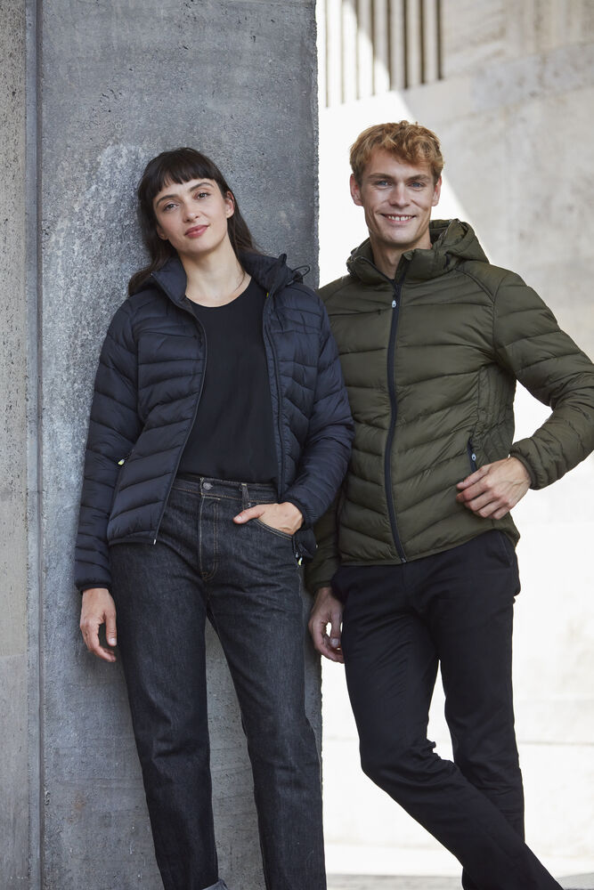 Lämmin mutta kevyt takki untuvaa muistuttavalla toppauksella. Valmistettu kierrätetystä polyamidista. Irrotettava huppu, 3 vetoketjullista ulkotaskua ja 2 sisätaskua. Joustavat resorit vyötäröllä ja hihoissa. Mukana värillinen ripustin, kätevä kuulokeratkaisu ja vetoketjun vedin.